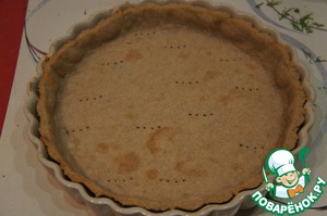 Тесто раскатать довольно тонко, но без фанатизма. Кусочек отрезать для украшения. Форму застелить пекарской бумагой и смазать маслом. Выложить тесто, оформив высокий бортик. Излишки теста отрезать. Дно наколоть вилкой и поставить форму в духовку, нагретую до 180-190*С на 15-20 минут.