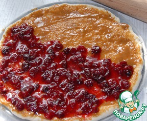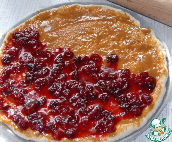 Подошедшее тесто делим на пять частей, каждую раскатываем в круглую лепешку около 24 см. Берем форму для выпечки 24 см. Дно застилаем пергаментом, стенки смазываем растительным маслом. Выкладываем первый пласт, смазываем 1/4 ореховой пасты, а затем выкладываем 1/4 клюквы. Кладем следующий пласт.