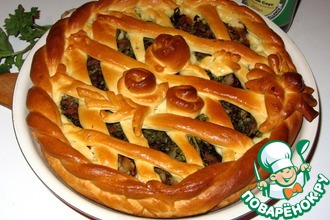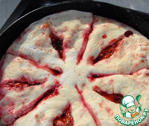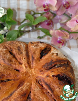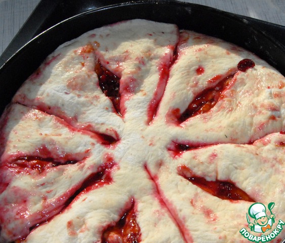Собрав пирог, делаем пять радиальных разрезов, немного не доходя до середины. Получается пять частичек, внутри каждой делаем неглубокие на 2-3 слоя надрезы, немного раздвигая из в стороны. Далее включаем духовку на разогрев до 200 градусов. Пока она греется, пирог немного расстоится. Выпекаем 35-40 минут.