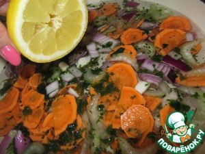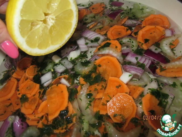В другом сотейнике залить литром воды крупно нарезанную луковицу и крупно нарезанную морковь, сельдерей, добавить петрушку, небольшой помидор, веточку тимьяна, по щепотке соли и перца, сок одного лимона и варить полчаса на медленном огне.