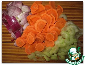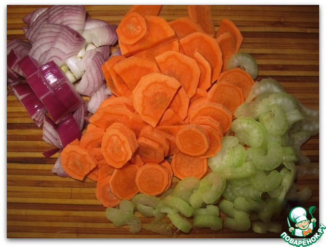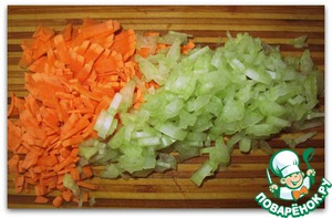 Мелко нарезать одну морковь, одну луковицу и один стебель сельдерея.