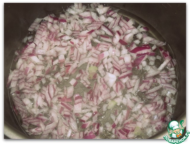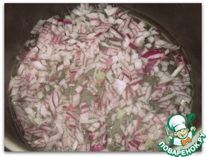 На дно сотейника я первыми положила лук и обжарила его на масле примерно минутку, может, меньше.