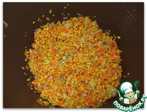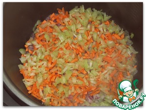 С морковью и сельдереем перемешать лук и обжаривать 2-3 минуты