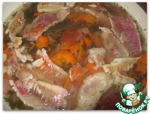Потом положить в бульон барабульку и варить еще 7 минут.