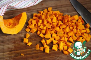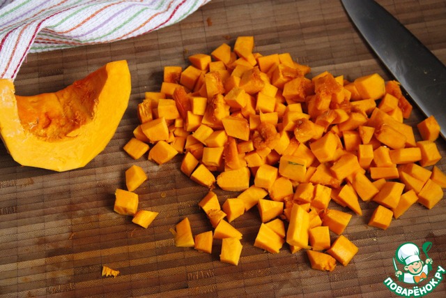 В это время очистить тыкву и нарезать её небольшими кубиками.