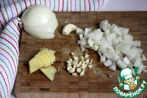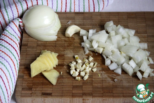 Очистить и мелко нарезать лук, чеснок и корень имбиря.