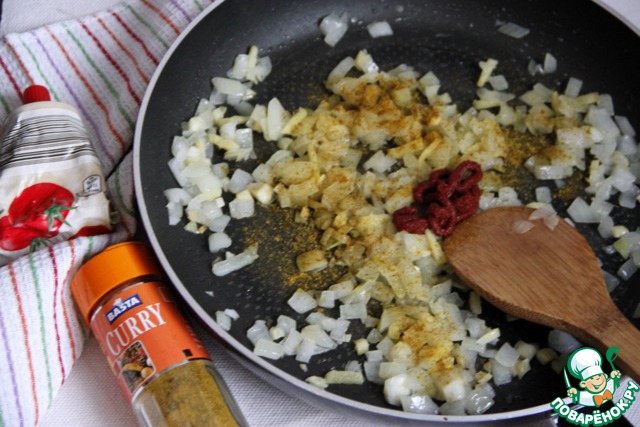 Разогреть в сковороде 1 ст. л. растительного масла, обжарить лук и чеснок до прозрачности, добавить имбирь, томатную пасту, порошок карри и потушить буквально минутку, чтобы смешать вкусы.