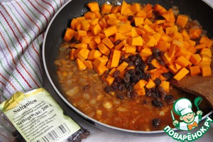 Добавить тыкву, воду и изюм. Тушить всё вместе 10 минут, до готовности тыквы.