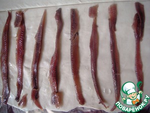 Острым ножом разрезать на полоски толщиной примерно 1 см (резать поперек полосок с анчоусами)