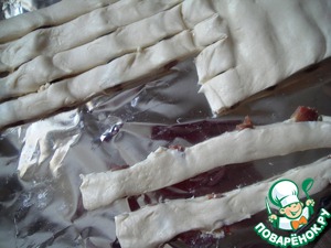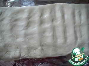 1 лист готового бездрожжевого слоеного теста (половинку упаковки) раскатать по длине примерно в 1,5 -2 раза, разрежать пополам