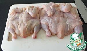 Берем молодых цыплят. Хорошенько их промываем, высушиваем бумажными полотенцами и пластаем так.