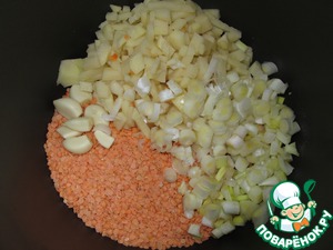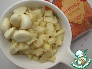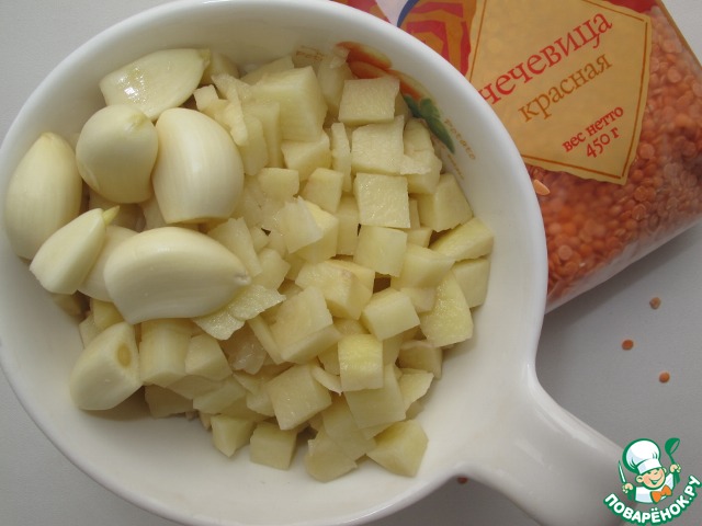 • Чечевицу, картофель, лук и чеснок поместить в кастрюлю, залить водой.