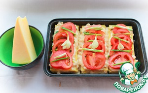 На верхний слой нашей лазаньи укладываем перья зелёного лука, раздавленные зубчики чеснока и помидоры, нарезаные кружочками.