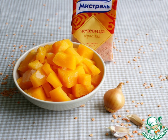 Начнем с необходимых продуктов: красная чечевица Мистраль, тыква сладкая, лук репчатый белый, чеснок, свежий корень имбиря. Пока вроде все просто и находится дома или на местном колхозном рынке)