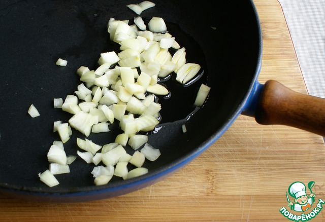 Готовить будем в тяжелой сковороде с толстым дном и стенками. Почистим, нарежем мелко лук, чеснок. Обжарим пару минут на растительном масле (я взяла кукурузное, потому что оно не имеет сильно выраженного запаха, как оливковое или подсолнечное).