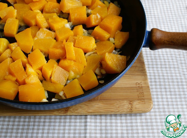 Тыква у меня замороженная и уже нарезанная на небольшие кусочки (размораживала часик на воздухе).