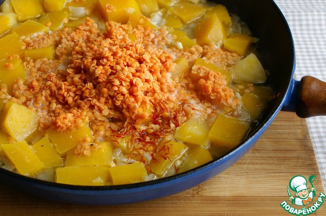 В плане пропорций: средняя мисочка тыквы и чайная чашка чечевицы. Визуально думаю, что понятно)