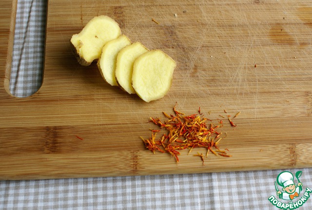 Из специй я выбрала свежий имбирь и шафран (все можно найти на том же колхозном рынке у таджиков). Имбирь почистить, натереть на мелкой терке или мелко нарезать ножом.
