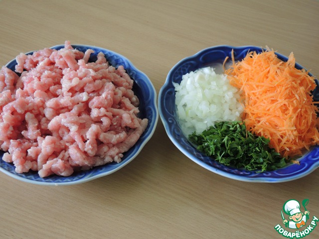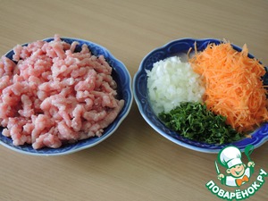 Измельчаем лук, зелень, трем на мелкой терке морковь. У меня был кусок свиной вырезки, я перекрутила его через мясорубку.
