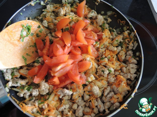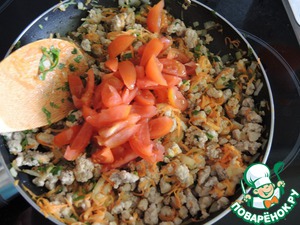 Обжариваем фарш с луком, зеленью и морковью. Добавляем помидоры, жарим еще 5 минут.