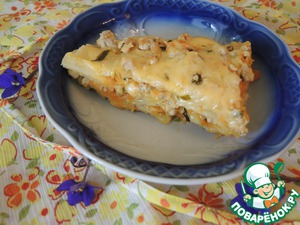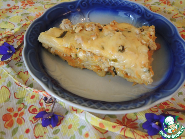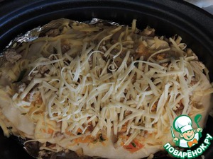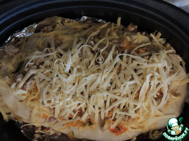 На дно формы выкладываем слой фарша, затем лист лазаньи, слой тертого сыра. Затем – опять фарш, лист лазаньи, сыр, и так далее. Заканчиваем слоем фарша, посыпанным тертым сыром. Многие отваривают листы лазаньи в подсоленной воде. Я использовала не отваренные. На ваше усмотрение.
