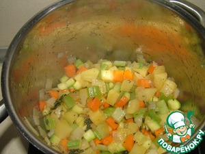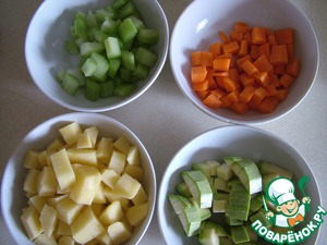 Овощи (кроме брокколи) нарезаем средними кубиками, чеснок мелко рубим.