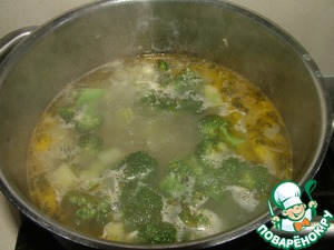 Затем добавляем овощной бульон (можно воду) и доводим до кипения на сильном огне. Варим минут 7 на слабом огне, добавляем соцветия брокколи и продолжаем варить еще 5-7 минут. Солим и перчим по вкусу, выключаем огонь, накрываем и даем минестроне настояться и раскрыться всем его ароматам 10 минут.