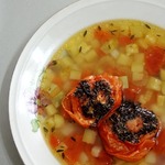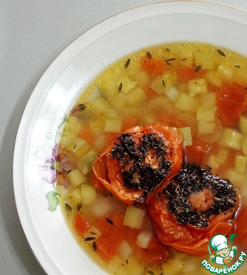 Подаем горячий минестроне, украсив его вялеными томатами и тимьяном. За рецепт вяленых томатов в микроволновке отдельное спасибо Ольге Бабич!