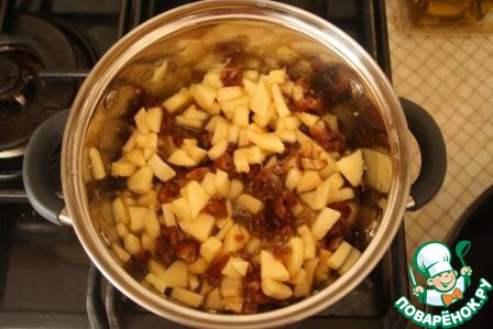 Добавляем в кастрюлю яблоки и финики. Даем немножко пропитаться.