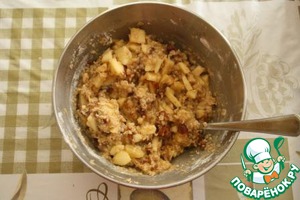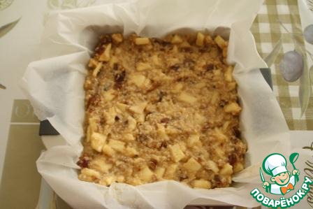 Форму застилаем бумагой для выпечки. Выкладываем смесь слоем три сантиметра. Ставим в предварительно разогретую до 180 градусов духовку на 20 минут.