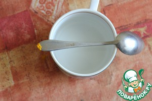 В 150 мл кипятка добавить на кончике ножа шафран (или заменить на куркуму), перемешать и оставить, чтобы шафран дал цвет. Остудить воду, чтобы она была теплой.