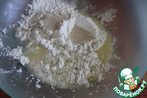 В миску насыпать муку, соль, дрожжи, оливковое масло. Добавить теплую шафрановую воду. Хорошо перемешать массу. Выложить тесто на стол и хорошо вымесить около 10 минут. Положить тесто обратно в миску, накрыть пленкой и оставить в теплом месте на 30-40 минут, чтобы тесто увеличилось.