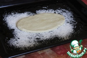 После тесто раскатать в овал шириной в 1 см. Положить тесто на противень выстеленный бумагой для выпечки (или смазанный маслом и присыпанный мукой) и оставить ещё на 20-30 минут.