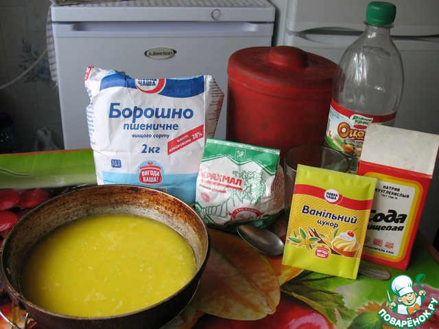 Масло растопить добавить сахар, яйца, крахмал, муку, сахар ванильный и соду.