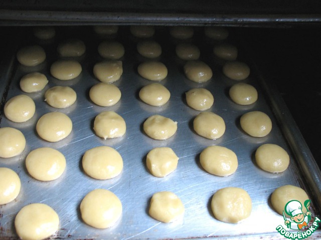 Противень смазать растительным маслом. Отрывать от теста небольшие кусочки, делать шарики и класть на противень, чуть придавливая. Наши печеньки при выпекании увеличиваются в два-три раза, поэтому следует класть их на небольшом расстоянии друг от друга.