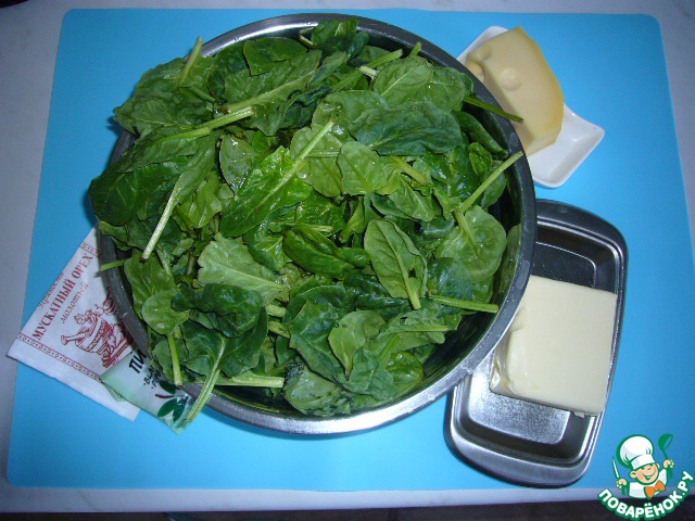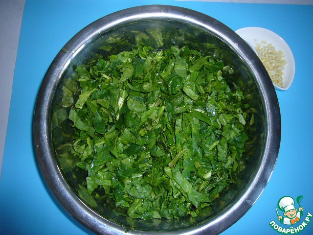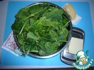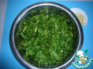 Листочки шпината нарежьте соломкой, чеснок - мелко порубите.