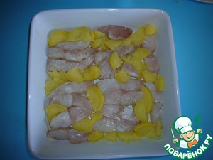 В форму, слегка смазанную маслом, выложить слоями рыбу и картофель (можно, как у меня, заполнять пустоты между кусочками рыбы картофелем).