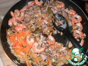 Морепродукты выкладываем к нашим обжаренным овощам и тушим 5 минут