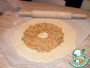 Тесто раскатываем в круг на бумаге для выпечки и укладываем на него начинку кольцом.