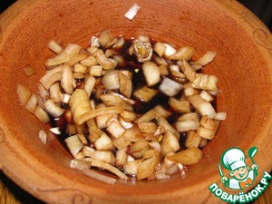 Лук нарезать кубиками и поместить его в маринад из 3 ст. л. винного уксуса и 5 ст. л. соевого соуса, хорошо перемешать и оставить на 15 минут.