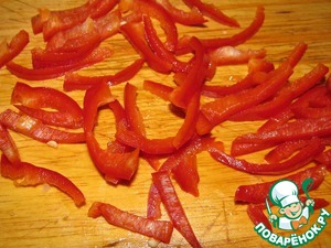 Перец нарезать соломкой. Лучше, если будет разноцветный, у меня был только красный.