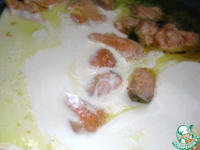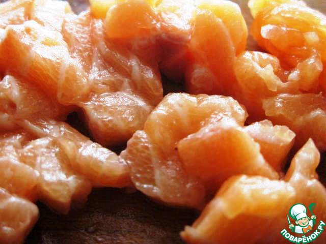 • Пока варится паста, делаем соус. Лосось мелко режем.