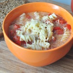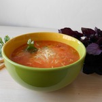 В куриный бульон (или воду, если хотите, чтобы суп был менее насыщенным) опустить обжаренные овощи, кусочки курицы, очищенные томаты вместе с соком, довести до кипения, уменьшить огонь. -