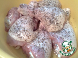 Куриные ножки вымыть, обсушить, смазать солью, перцем и лимонным соком