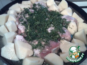 Куриные ножки выложить в смазанную маслом форму, посыпать рубленой зеленью