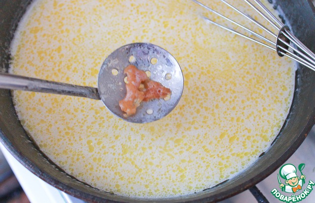 Масло с сахаром сначала будет пениться, а потом появятся хлопья светло-коричневого цвета.