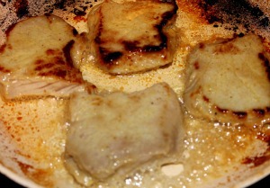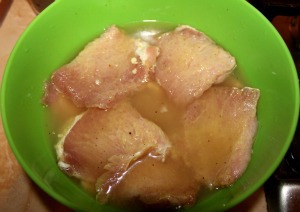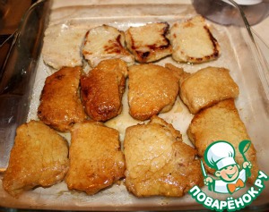 Как мяско промаринуется-немного промокнуть бумажным полотенцем лишнюю ананасовую жидкость и обжариваем мяско на разогретой сковороде (буквально по минутке с каждой стороны). Из-за ананасового сока безумно много брызг. Я вокруг плиты и стенку застилаю газетками или тряпочками