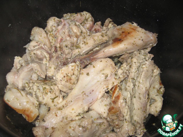 Мультиварку устанавливаем на режим"Мясо"- 50 минут. В разогретое оливковое масло выкладываем кролика (лимоны не берем). Если готовим в духовке-то либо обжаривайте на глубокой сковороде, либо сразу-в огнеупорной посуде