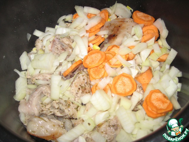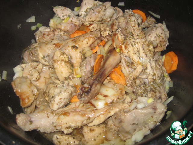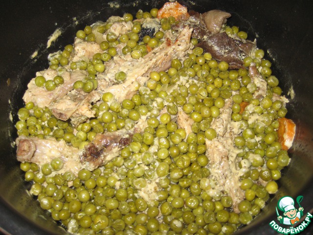 Также-сливки. Если Вы готовите в духовке-в этот момент накрывайте посуду крышкой и ставьте в разогретую до 220* духовку примерно на час. Через час-добавляем зеленый горошек и ставим под крышкой еще на часок