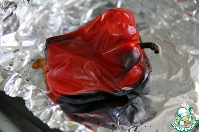 Болгарский перец кладем на протвинь, выстланный фольгой, и ставим в предварительно нагретую до 200 градусов духовку.